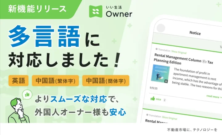 オーナーアプリ「いい生活Owner」にて多言語化対応を開始<ニュース概要>外国人オーナーとの円滑なコミュニケーション環境を整備株式会社…