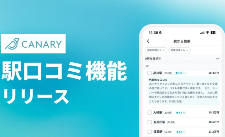 不動産情報アプリ「カナリー(CANARY)」に新機能 駅検索時に口コミを表示