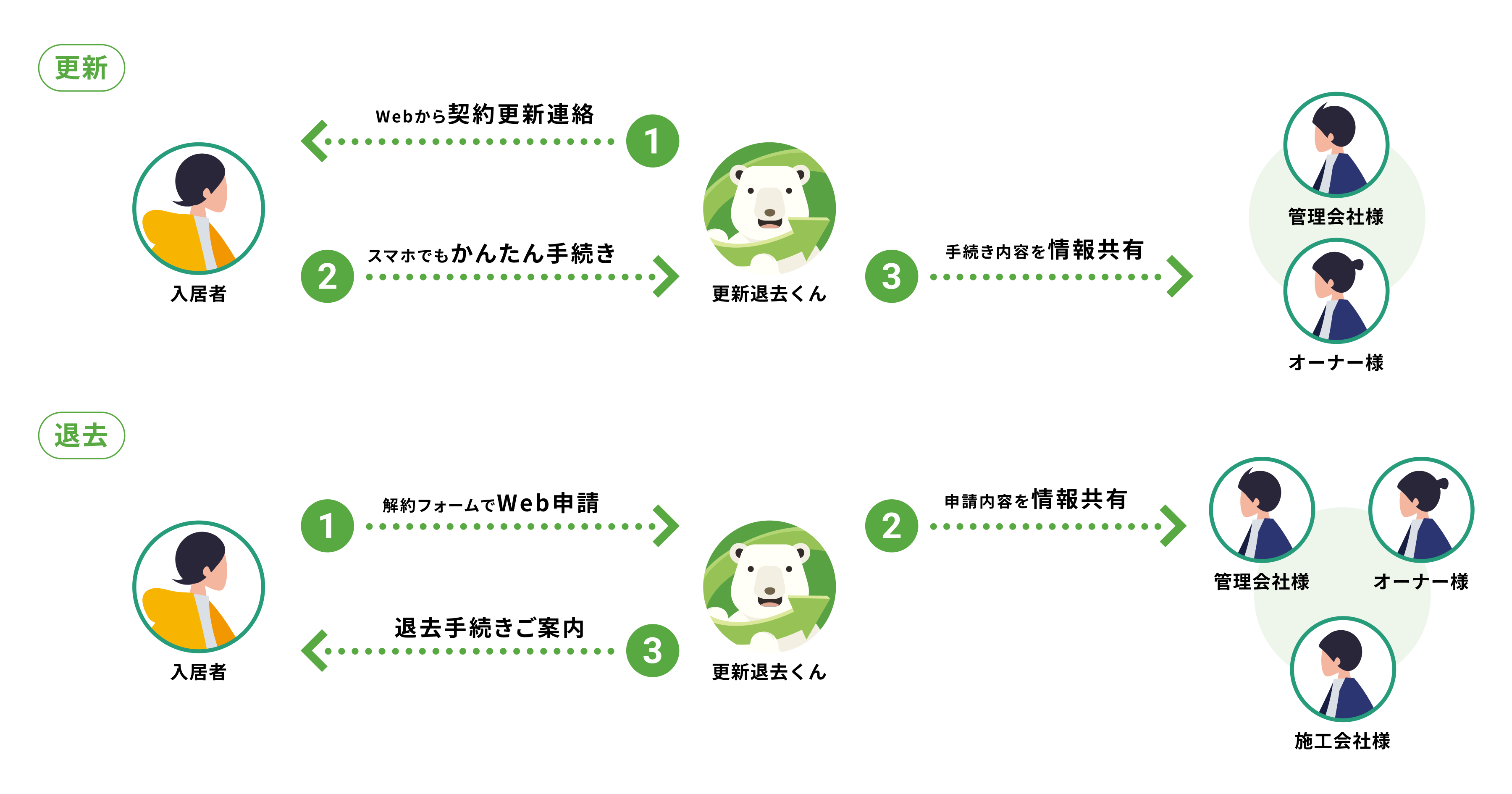 「更新退去くん」は、マイページ機能とチャット等によるコミュニケーションで、⼊居時・⼊居中・更新退去時に必要な各種申請をオンライン上で⾏うことができ、⼊居者とのスムーズなやりとりを可能にする、賃貸住宅の更新・退去システムです。解約申請機能や、電⼦契約機能、帳票作成機能によって、更新・退去に関する⼿続きをオンライン上で完結させることが可能になります。また、更新・退去に関する進捗状況を、オーナーや保証会社、ハウスクリーニング会社などの関係者へリアルタイムに共有可能になります。2024年1月には、鍵の受領やペット飼育、施設利⽤などの⼊居中に必要な各種申請を⾏える機能も登場しました。また、賃貸物件の入居申込システム「申込受付くん」、不動産関連電⼦契約システム「電⼦契約くん」との連携により、⼊居申し込みから更新・退去まで⼀気通貫の顧客管理を可能にし、体験価値向上に貢献いたします。