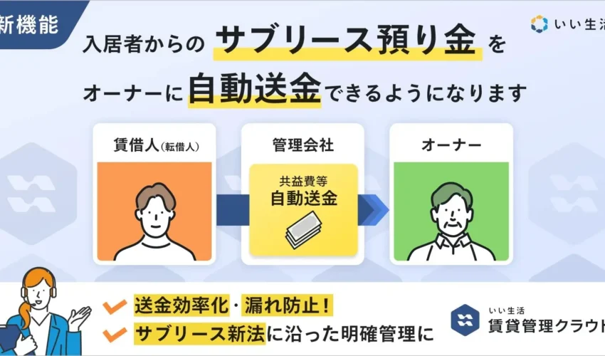株式会社いい生活は2024年11月、同社が提供する「いい生活賃貸管理クラウド」に「サブリース預り金送金機能」を実装したことを発表しました。この新機能により、サブリース事業者(不動産管理会社)は転借人から預かった共益費などを不動産オーナーへ自動送金できるようになり、業務の効率化が期待されています。サブリース事業者と不動産オーナーとの多様なマスターリース契約に応えるとともに、法整備が進むサブリース事業の明晰化に貢献します。