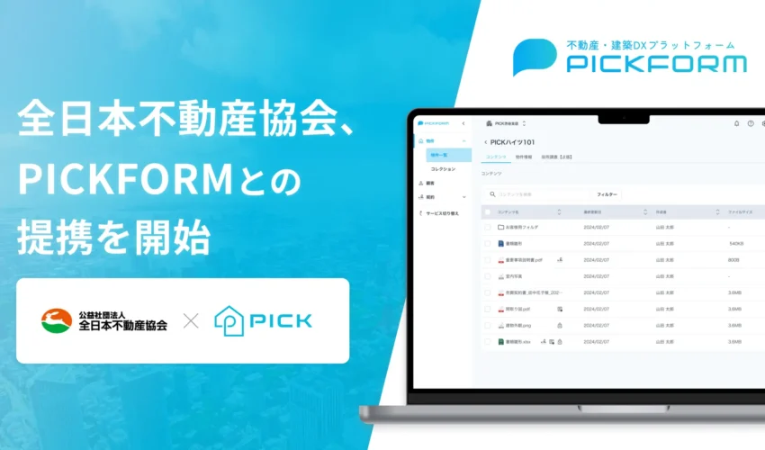 不動産・建築DXプラットフォームを展開する株式会社PICKは、約3万5000社が加盟する公益社団法人全日本不動産協会(以下、全日)と提携し、同社が提供する電子契約サービス「PICKFORM」を全日加盟企業向けに初期費用無料(※別途初期サポートプランあり)で提供することを発表しました。
