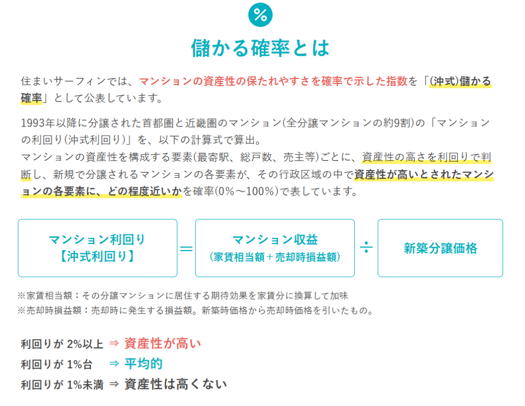 「沖式儲かる確率」とは、過去の物件の含み益が出た割合をカテゴリー毎に算出し、その物件の属するカテゴリー別数値を平均して算出しています。カテゴリーは徒歩圏であれば、5分以内、10分以内のように分割されています。対象カテゴリーは、立地(行政区・駅・徒歩)、物件属性(総戸数・階数・面積帯・価格帯)などで構成されています。