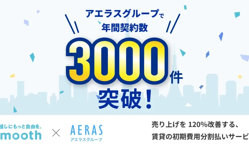 首都圏を中心に67店舗を展開する不動産会社・株式会社アエラスが、株式会社スムーズの提供する賃貸初期費用分割払いサービス「スムーズ」を導入し、グループ全体で年間3,000件を超える契約実績を上げていることが明らかになりました。
