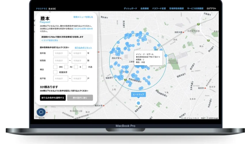 利用者は「分譲 / 一棟」「築年数」「総階数」「構造」「総戸数」「平均賃料単価」「稼働率」「空室の有無」などの条件を自由に組み合わせ、目的に合ったマンションやアパートを自動抽出できます。 - オンライン依頼による迅速な納品
