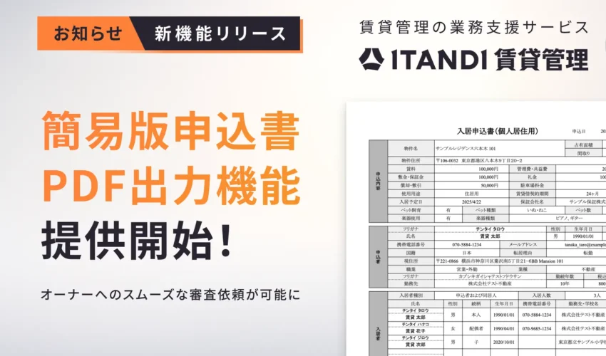 イタンジ株式会社は2025年9月9日、同社が提供する賃貸管理の業務支援サービス「ITANDI 賃貸管理」の申込システムにおいて、不動産オーナーが入居審査をするために確認する、簡易版申込書を出力する機能を提供開始開始しました。