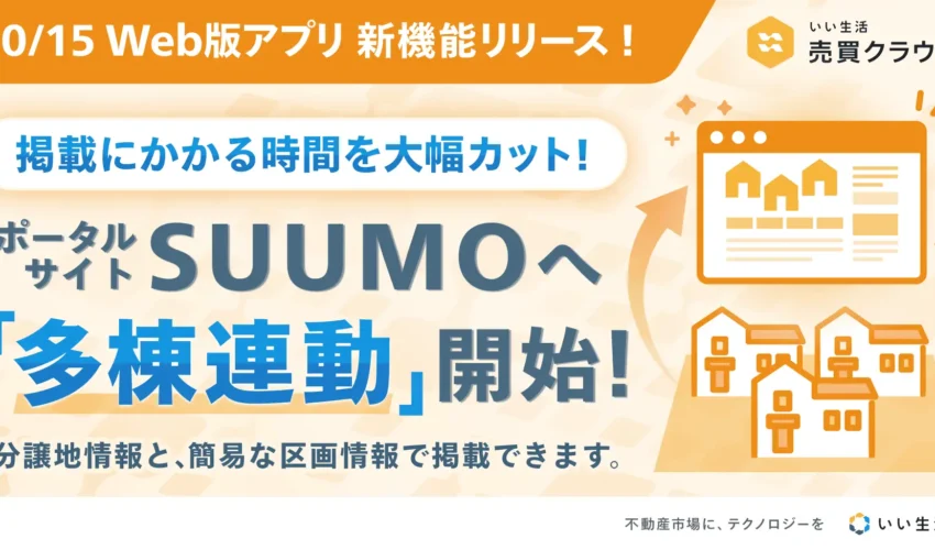 株式会社いい生活は、「いい生活売買クラウド Web版アプリ」において、新たに「多棟連動機能」をリリースしたことを発表しました。本機能により、不動産ポータルサイトSUUMOへの分譲地の複数区画の広告掲載作業を大幅に削減します。