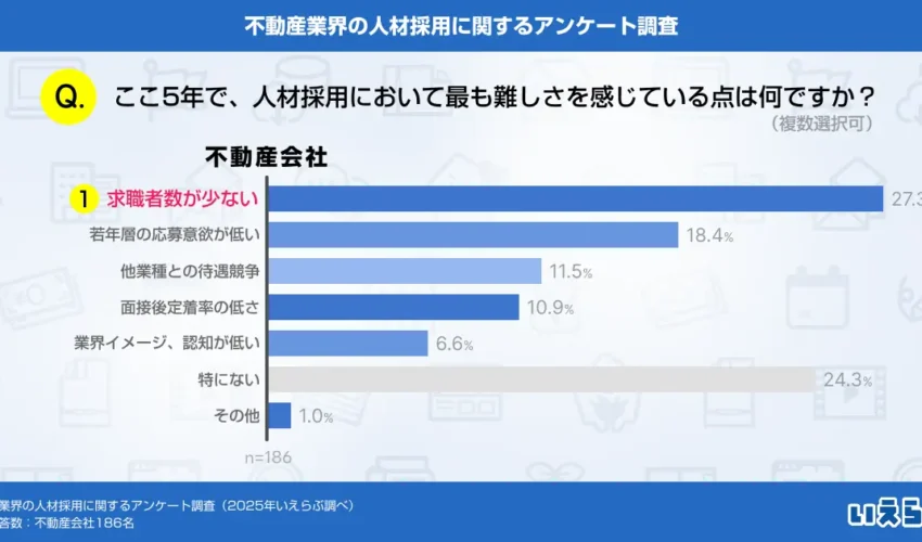 株式会社いえらぶGROUPは、不動産会社を対象に「不動産業界の人材採用に関するアンケート調査」を実施し、有効回答186件の結果を公表しました。調査では、業界全体で人手不足や若年層の採用難といった課題が浮き彫りとなりました。