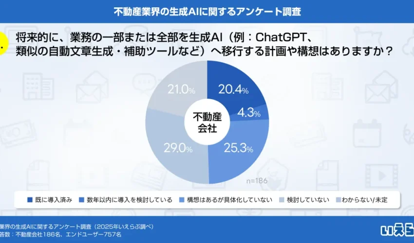 不動産会社の2割が業務に生成AIを導入済み、エンドユーザーのAI利用意向は賛否が分かれる結果に|いえらぶ調べ