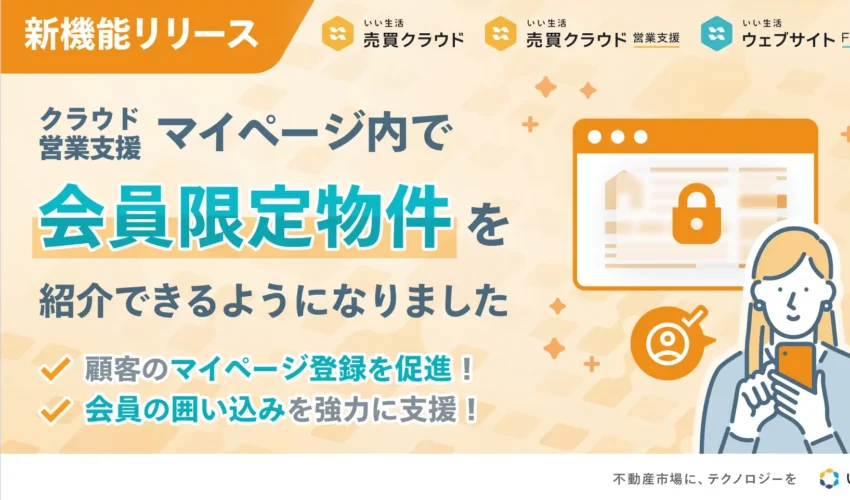 株式会社いい生活は、「いい生活売買クラウドOne」「いい生活売買クラウド 営業支援」「いい生活ウェブサイト」が連携する『会員限定物件表示機能』をリリースしたと発表しました。