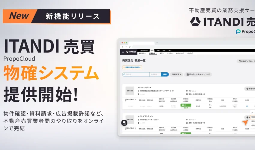 イタンジ株式会社は、2026年1月より、同社が提供するリアルタイム不動産業者間サイト「ITANDI BB」において、不動産売買物件における売主側の仲介会社が、物件確認・資料請求・広告掲載許諾など不動産業者間のやり取りをオンラインで完結できる、「ITANDI 売買 PropoCloud」 物確システムの提供を開始すると発表しました。