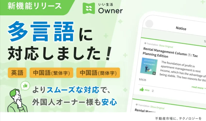 株式会社いい生活は、同社が提供するオーナー向けアプリ「いい生活Owner」において、多言語化対応を開始したと発表しました。