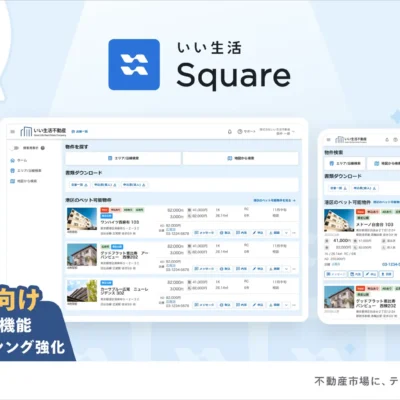 「いい生活Square」は、不動産管理会社・賃貸仲介会社の業務に特化した賃貸業者間流通サイトです。対面接客、電話、郵送など煩雑になりがちな入居手続きをオンライン化し、業務効率化や働き方改革、新たな売上機会の創出に貢献するプラットフォームとして展開されています。
