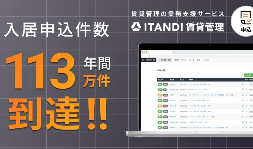 イタンジ株式会社は、同社が提供する賃貸管理の業務支援サービス「ITANDI 賃貸管理」申込システムによる2025年度の入居申込件数が113万件に到達したと発表しました。
