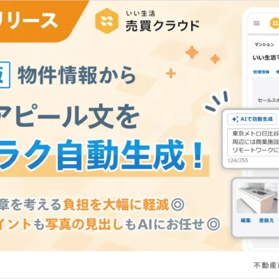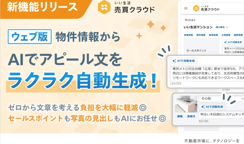 株式会社いい生活は、「いい生活売買クラウド」において、コメントAI自動生成機能をリリースしたと発表しました。